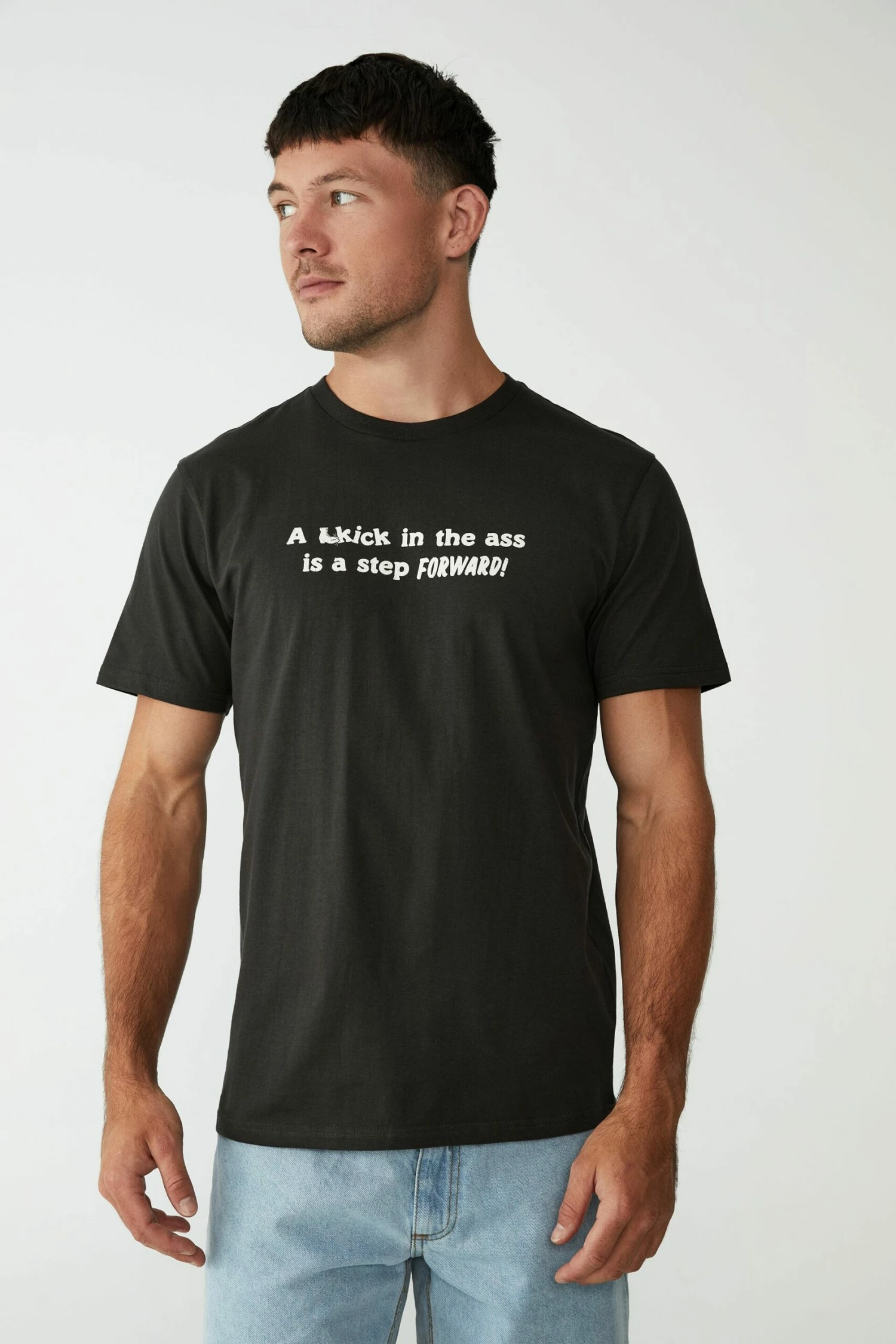 - Crew neckline short sleeve graphic text T-shirt